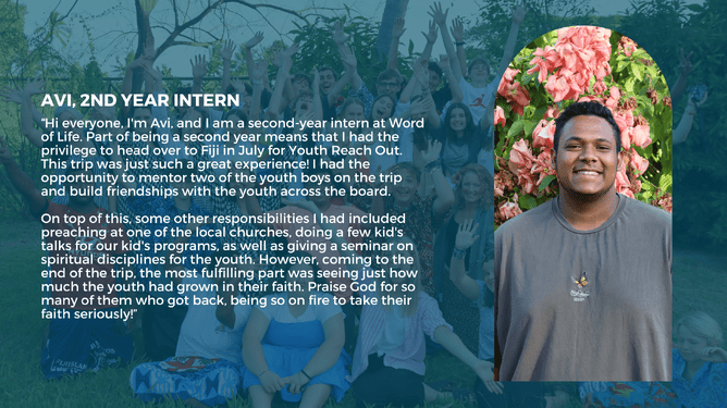 Avi and Aimee, two of our 2nd year interns, were a part of the leadership team on Youth Reachout this year. They were a great asset to our team and their previous mission experience in Fiji was evident to see. Our time in Fiji has two focusses; firstly, to serve and support the Word of Life Fiji team through running various outreaches and camps. Secondly, to disciple and equip our students in personal growth and ministry skills. Both Avi and Aimee each taught a seminar, mentored two students and were the speakers at different events.